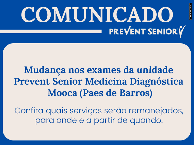 Exames da unidade Prevent Senior Medicina Diagnóstica Mooca (Paes de Barros) serão transferidos